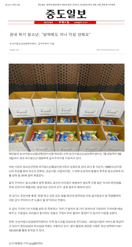 -논산시청소년상담복지센터 ‘위기청소년에 최초로 방학중 급식꾸러미 지원’-