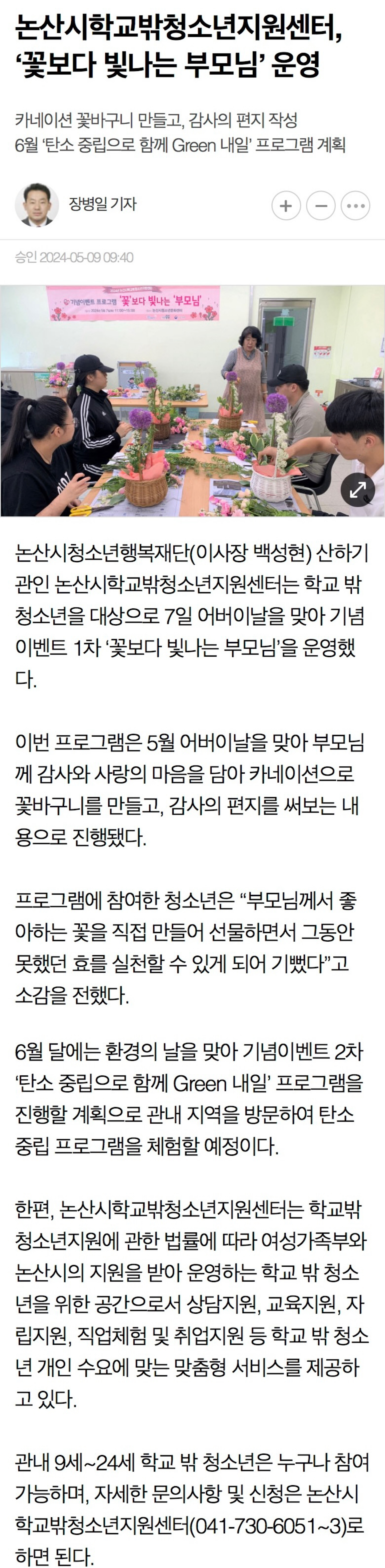 논산시청소년행복재단(이사장 백성현) 산하기관, 논산시학교밖청소년지원센터는 학교 밖 청소년을 대상으로 지난 7일 어버이날을 맞이하여 기념이벤트 1차, ‘꽃보다 빛나는 부모님’을 운영했다.
