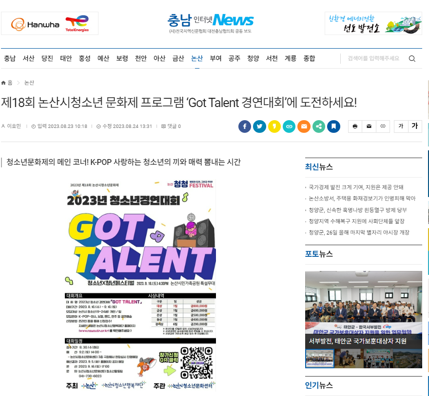 올해로 18회째를 맞는 논산시청소년문화제의 메인 코너라 할 수 있는 ‘Got Talent 경연대회’를 앞두고, 논산시청소년행복재단 청소년문화센터가 참가자를 모집한다.