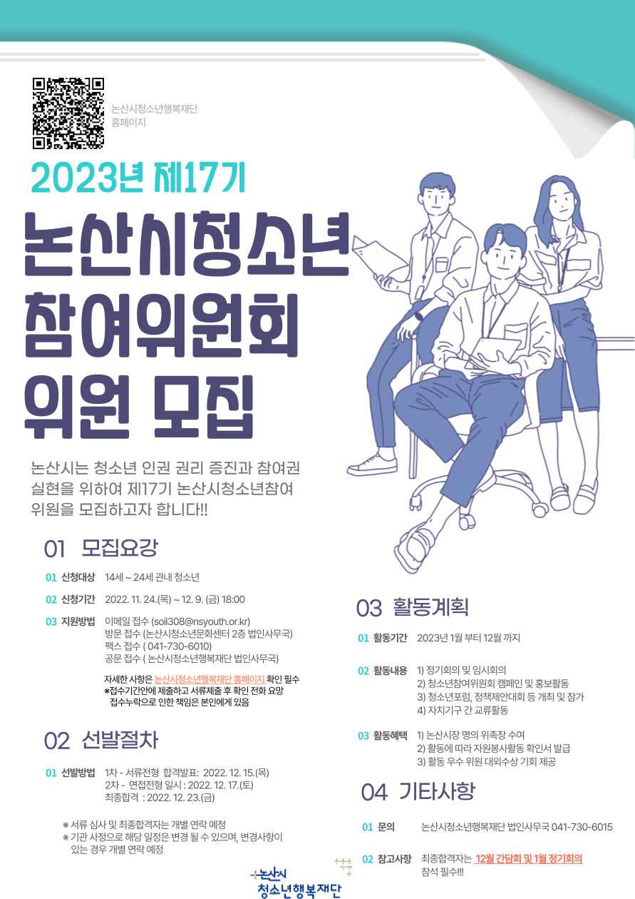 논산시는 청소년 인권 권리 증진과 참여권 실현을 위하여 2023년 ‘제17기 청소년참여위원회’를 오는 12월 9일까지 모집한다고 밝혔다.
