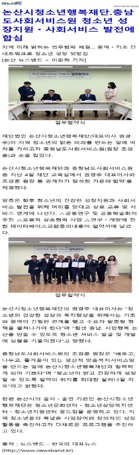 논산시청소년행복재단과 충청남도사회서비스원은 지난 4일 재단 교육실에서 권경주 대표이사와 조경훈 원장 등 관계자가 참석한 가운데‘협약’을 체결했다.